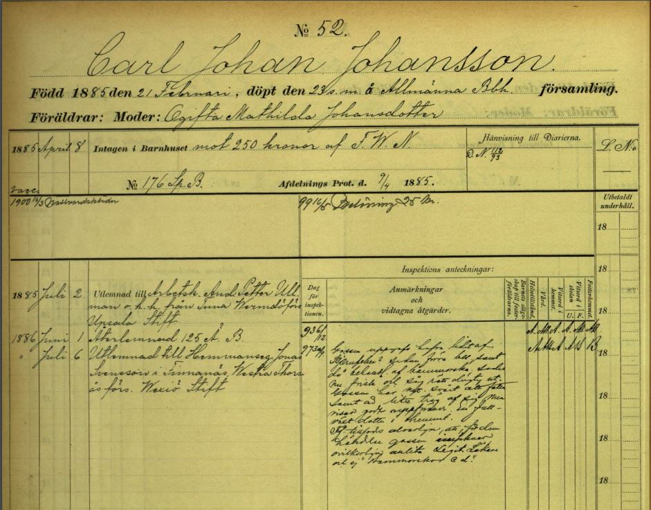 | Karl Johan Johansson Född 1885-02-21 i Stockholm (AB) 1 2 3 4 . Död 1964-09-30 i Ölands Åkerbo (H) 5 . | F [F] Anders Petter Ullman. Född 1855-06-17 i Rylanda, Ryda (R) 6 7 . Begravd 1934-04-15 i Surbrunnsgatan 3, Engelbrekt (AB) 8 . | FF Jonas Andersson Ullman. | ||